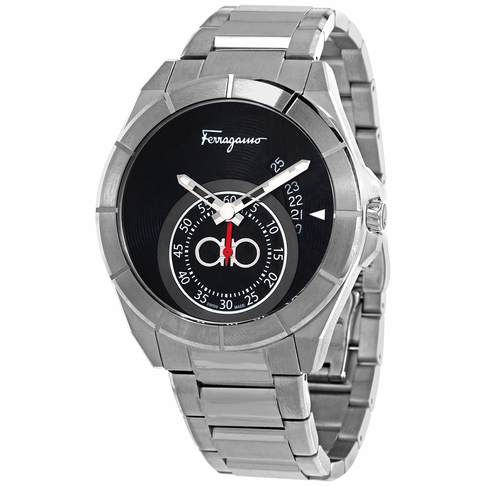 Stainless steel case with a stainless steel bracelet. Fixed stainless steel bezel. Black dial with luminous silver-tone hands. No markers. Dial Type: Analog. Luminescent hands. Date display at the 3 o'clock position. Seconds sub-dial. Quartz movement. Scratch resistant sapphire crystal. Pull / push crown. Solid case back. Round case shape. Case size: 43 mm. Case thickness: 9.65 mm. Band width: 22 mm. Fold over clasp with a push button release. Water resistant at 50 meters / 165 feet. Functions: date, hour, minute, second. Urban Series. Dress watch style. Watch label: Swiss Made. Ferragamo Urban Quartz Black Dial Mens Watch SF1Y00419.