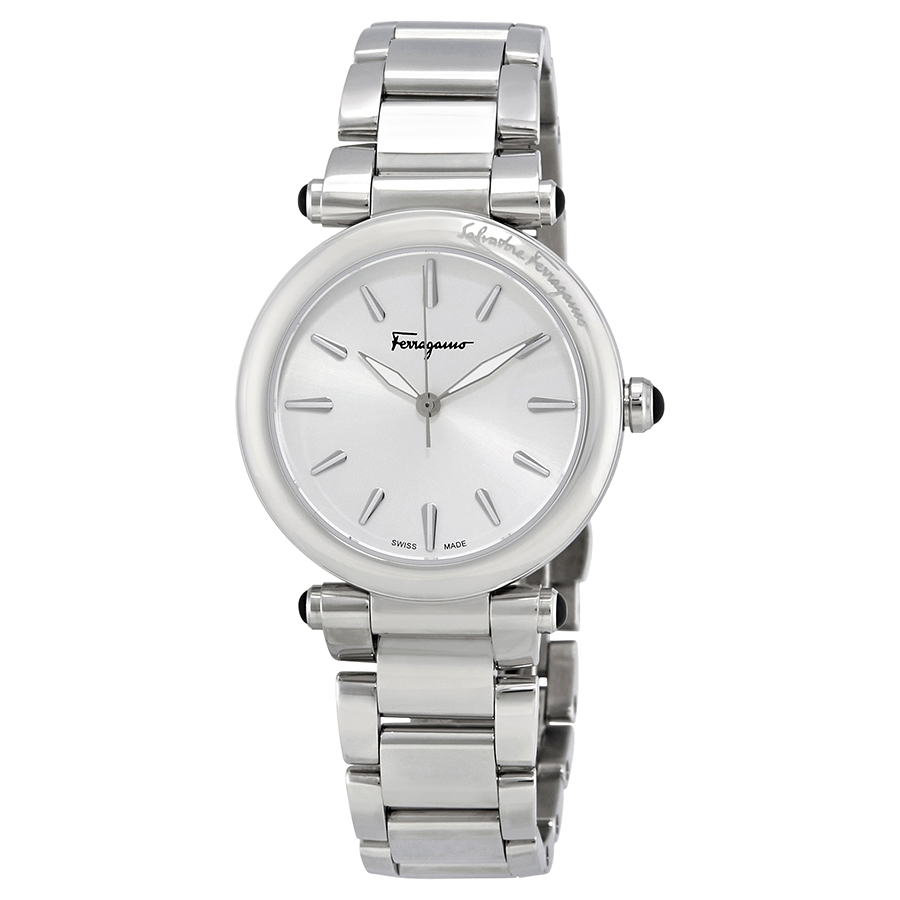 Stainless steel case with a stainless steel bracelet. Fixed stainless steel bezel. Silver dial with silver-tone hands and index hour markers. Dial Type: Analog. Quartz movement. Scratch resistant sapphire crystal. Pull / push crown. Solid case back. Case size: 34 mm. Case thickness: 10 mm. Round case shape. Band width: 18 mm. Fold over clasp with a safety release. Water resistant at 30 meters / 100 feet. Functions: hour, minute, second. Dress watch style. Watch label: Swiss Made. Ferragamo Idillio Silver Dial Stainless Steel Ladies Watch FCH110017.