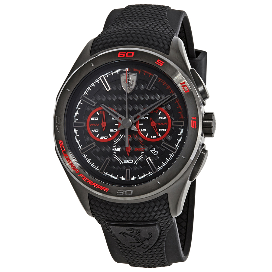 Black stainless steel case with a black nylon strap. Fixed black stainless steel bezel. Carbon fiber dial with grey hands and index hour markers. Minute markers around the outer rim. Dial Type: Analog. Date display between 4 and 5 o'clock position. Quartz movement. Scratch resistant mineral crystal. Pull / push crown. Solid case back. Round case shape, case size: 47 mm, case thickness: 13 mm. Band width: 24 mm. Buckle clasp. Water resistant at 50 meters / 165 feet. Functions: chronograph, date, hour, minute, second. Sport watch style. Watch label: Japan Movt. Ferrari Gran Premio Chronograph Mens Watch 830344.