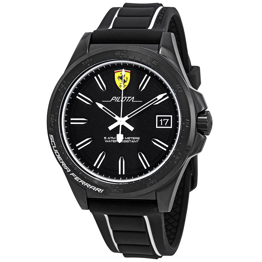 Black stainless steel case with a black and white silicone strap. Fixed black stainless steel bezel. Black dial with silver-tone hands and index hour markers. Minute markers around the outer rim. Dial Type: Analog. Date display at the 3 o'clock position. Quartz movement. Scratch resistant mineral crystal. Pull / push crown. Solid case back. Round case shape, case size: 43 mm, case thickness: 11 mm. Band width: 20 mm, band length: 8 inches. Buckle clasp. Water resistant at 50 meters / 165 feet. Functions: date, hour, minute, second. Casual watch style. Watch label: Japan Movt. Ferrari Pilota Black and White Dial Mens Watch 830422.
