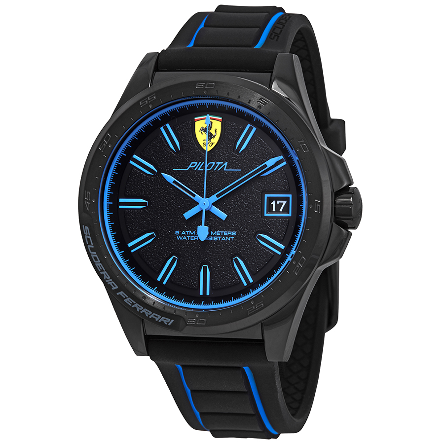 Black stainless steel case with a two-tone (black and blue) silicone strap. Fixed black stainless steel bezel. Black dial with blue hands and index hour markers. Minute markers around the outer rim. Dial Type: Analog. Date display at the 3 o'clock position. Quartz movement. Scratch resistant mineral crystal. Pull / push crown. Solid case back. Round case shape, case size: 43 mm, case thickness: 11 mm. Band width: 20 mm, band length: 8 inches. Buckle clasp. Water resistant at 50 meters / 165 feet. Functions: date, hour, minute, second. Casual watch style. Watch label: Japan Movt. Ferrari Pilota Black and Blue Dial Mens Watch 830423.