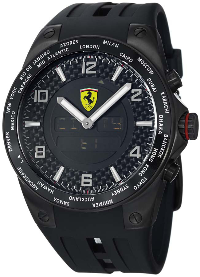 Black PVD stainless steel case with a black rubber strap. Black PVD stainless steel bezel. Black dial with silver-tone hands and index-Arabic numerals hour markers. Dial Type: Analog-digital. Luminescent hands and markers. Date display at the 3 o'clock position. Quartz movement. Scratch resistant sapphire crystal. Pull / push crown. Round case shape, case size: 45 mm, case thickness: 15 mm. Band width: 30 mm, band length: 8 inches. Tang clasp. Water resistant at 50 meters / 165 feet. Functions: GMT, second time zone with the city code, hour, minute, second, 24 hour tme display, alarm, chronograph, and timer. Ferrari World Time Alarm Chronograph Black Dial Mens Watch FE-05-IPB-FC.