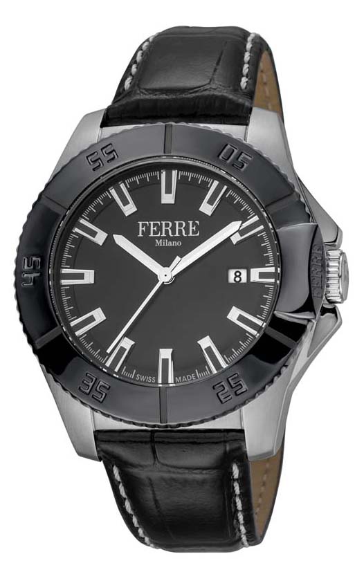 Silver stainless steel case with a black leather strap. Fixed silver stainless steel bezel. Black dial with silver-tone hands and index hour markers. Minute markers around the outer rim. Dial Type: Analog. Date display at the 3 o'clock position. Quartz movement. Scratch resistant mineral crystal. Push/pull crown. Round case shape, case size: 45 mm, case thickness: 11.8 mm. Band width: 18 mm, band length: 8.5 inches. Buckle clasp. Water resistant at 100 meters / 330 feet. Functions: date, hour, minute, second. Casual watch style. Watch label: Swiss Made. Ferre Milano Black Dial Mens Watch FM1G085L0041.