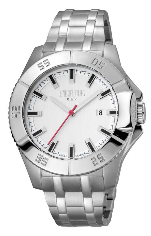 Silver stainless steel case with a silver stainless steel bracelet. Fixed silver stainless steel bezel. White dial with silver-tone hands and index hour markers. Minute markers around the outer rim. Dial Type: Analog. Date display at the 3 o'clock position. Quartz movement. Scratch resistant mineral crystal. Push/pull crown. Round case shape, case size: 45 mm, case thickness: 11.8 mm. Band width: 18 mm, band length: 8.5 inches. Deployment clasp. Water resistant at 100 meters / 330 feet. Functions: date, hour, minute, second. Casual watch style. Watch label: Swiss Made. Ferre Milano White Dial Mens Watch FM1G085M0051.