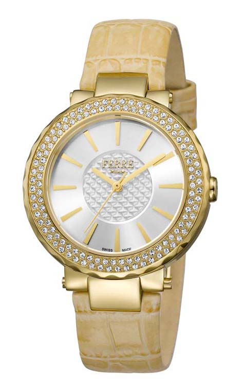 Gold-tone stainless steel case with a ivory leather strap. Fixed gold-tone stainless steel bezel. Silver dial with gold-tone hands and index hour markers. Dial Type: Analog. Quartz movement. Scratch resistant mineral crystal. Push/pull crown. Round case shape, case size: 36 mm, case thickness: 7.8 mm. Band width: 16 mm, band length: 7.5 inches. Buckle clasp. Water resistant at 50 meters / 165 feet. Functions: hour, minute, second. Casual watch style. Watch label: Swiss Made. Ferre Milano Silver Dial Ladies Watch FM1L058L0021.