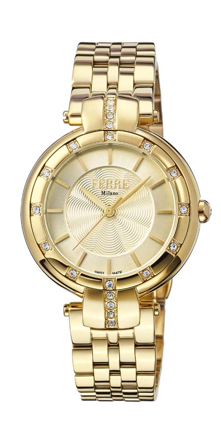 Gold-tone stainless steel case with a gold-tone stainless steel bracelet. Fixed gold-tone stainless steel bezel. Gold dial with gold-tone hands and index hour markers. Dial Type: Analog. Quartz movement. Scratch resistant mineral crystal. Push/pull crown. Solid case back. Round case shape, case size: 34 mm, case thickness: 8.55 mm. Band width: 14 mm, band length: 7.5 inches. Deployment clasp. Water resistant at 50 meters / 165 feet. Functions: hour, minute, second. Casual watch style. Watch label: Swiss Made. Ferre Milano Gold Dial Ladies Watch FM1L069M0071.