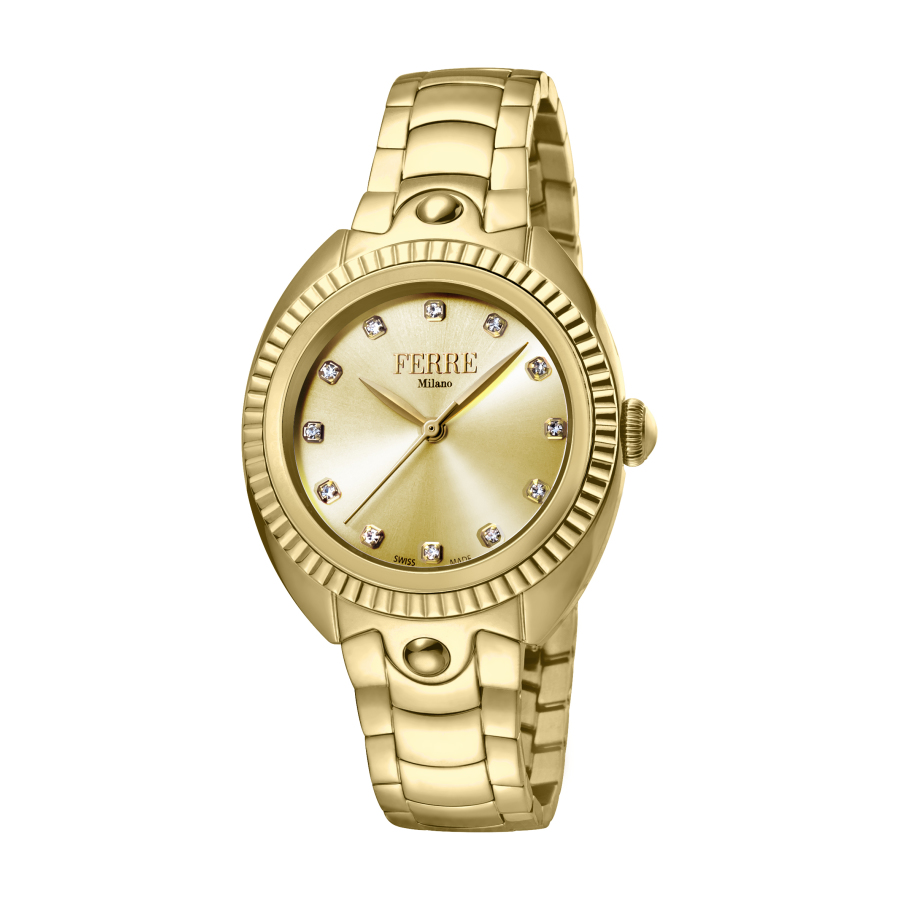 Gold-tone stainless steel case with a gold-tone stainless steel bracelet. Fixed gold-tone stainless steel bezel. Champagne dial with gold-tone hands and index hour markers. Dial Type: Analog. Quartz movement. Scratch resistant mineral crystal. Pull / push crown. Solid case back. Round case shape, case size: 34 mm, case thickness: 8 mm. Band width: 14 mm, band length: 7 inches. Deployment with push button release clasp. Water resistant at 50 meters / 165 feet. Functions: hour, minute, second. Fashion watch style. Ferre Milano Quartz Champagne Dial Ladies Watch FM1L088M0061.