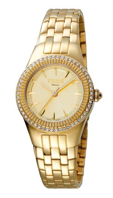 Gold-tone stainless steel case with a gold-tone stainless steel bracelet. Fixed gold-tone stainless steel bezel. Gold dial with gold-tone hands and index hour markers. Minute markers around the outer rim. Dial Type: Analog. Quartz movement. Scratch resistant mineral crystal. Push/pull crown. Round case shape, case size: 30 mm, case thickness: 8 mm. Band width: 14 mm, band length: 7.5 inches. Deployment clasp. Water resistant at 50 meters / 165 feet. Functions: hour, minute, second. Casual watch style. Watch label: Swiss Made. Ferre Milano Gold Dial Ladies Watch FM1L089M0061.