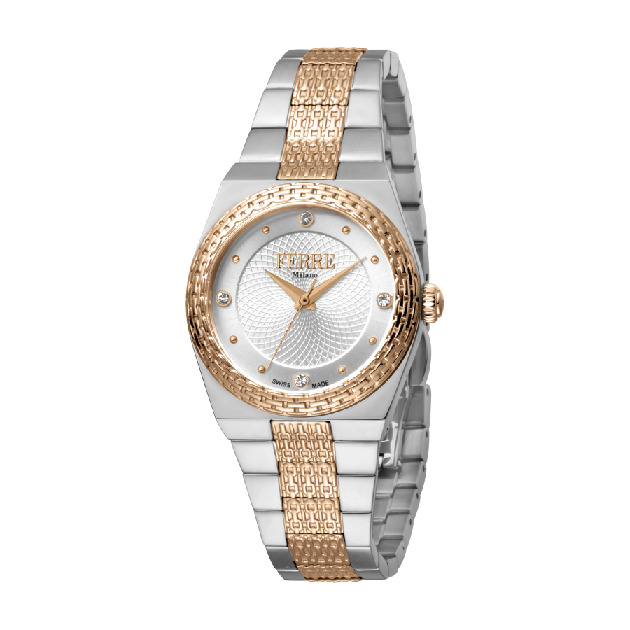 Silver-tone stainless steel case with a two-tone stainless steel bracelet. Fixed rose gold-tone bezel. Silver-tone dial with rose gold-tone hands and index hour markers. Dial Type: Analog. Quartz movement. Scratch resistant mineral crystal. Pull / push crown. Solid case back. Round case shape, case size: 30 mm, case thickness: 9 mm. Band width: 14 mm, band length: 7 inches. Deployment with push button release clasp. Water resistant at 50 meters / 165 feet. Functions: hour, minute, second. Fashion watch style. Watch label: Swiss Made. Ferre Milano Quartz Silver Dial Ladies Watch FM1L091M0051.