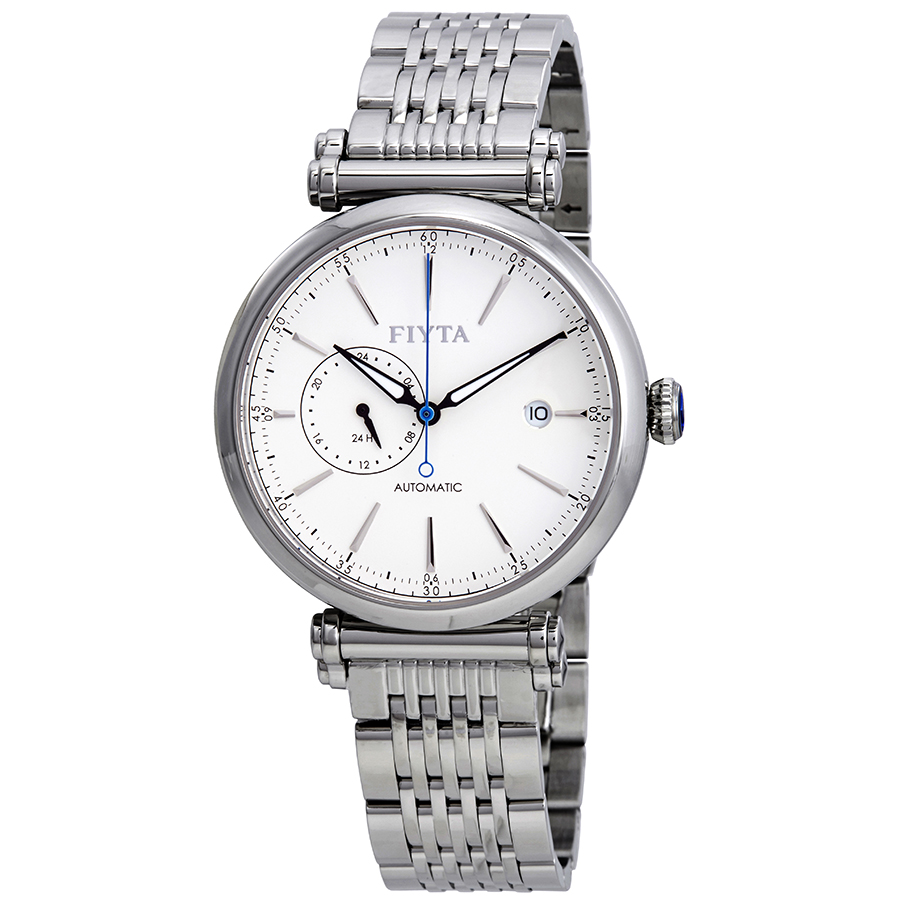 Silver-tone stainless steel case with a silver-tone stainless steel bracelet. Fixed silver-tone stainless steel bezel. White dial with black hands and index hour markers. Minute markers around the outer rim. Dial Type: Analog. Date display at the 3 o'clock position. 24 hour subdials. Miyota Caliber 8217 automatic movement with a 40-hour power reserve. Scratch resistant sapphire crystal. Pull / push crown. Transparent case back. Round case shape, case size: 41.5 mm, case thickness: 12.15 mm. Band width: 18 mm. Butterfly clasp. Water resistant at 50 meters / 165 feet. Functions: date, hour, minute, second. Casual watch style. Watch label: Japan Movt. Fiyta IN Automatic White Dial Mens Watch GA850002.WWW.