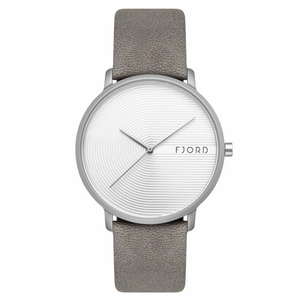 Silver-tone stainless steel case with a grey leather strap. Fixed silver-tone stainless steel bezel. White dial with silver-tone hands and index hour markers. Dial Type: Analog. Quartz movement. Round case shape, case size: 40 mm. Functions: hour, minute, second. Erik Series. Dress watch style. Fjord Erik White Dial Mens Watch FJ-3059-01.