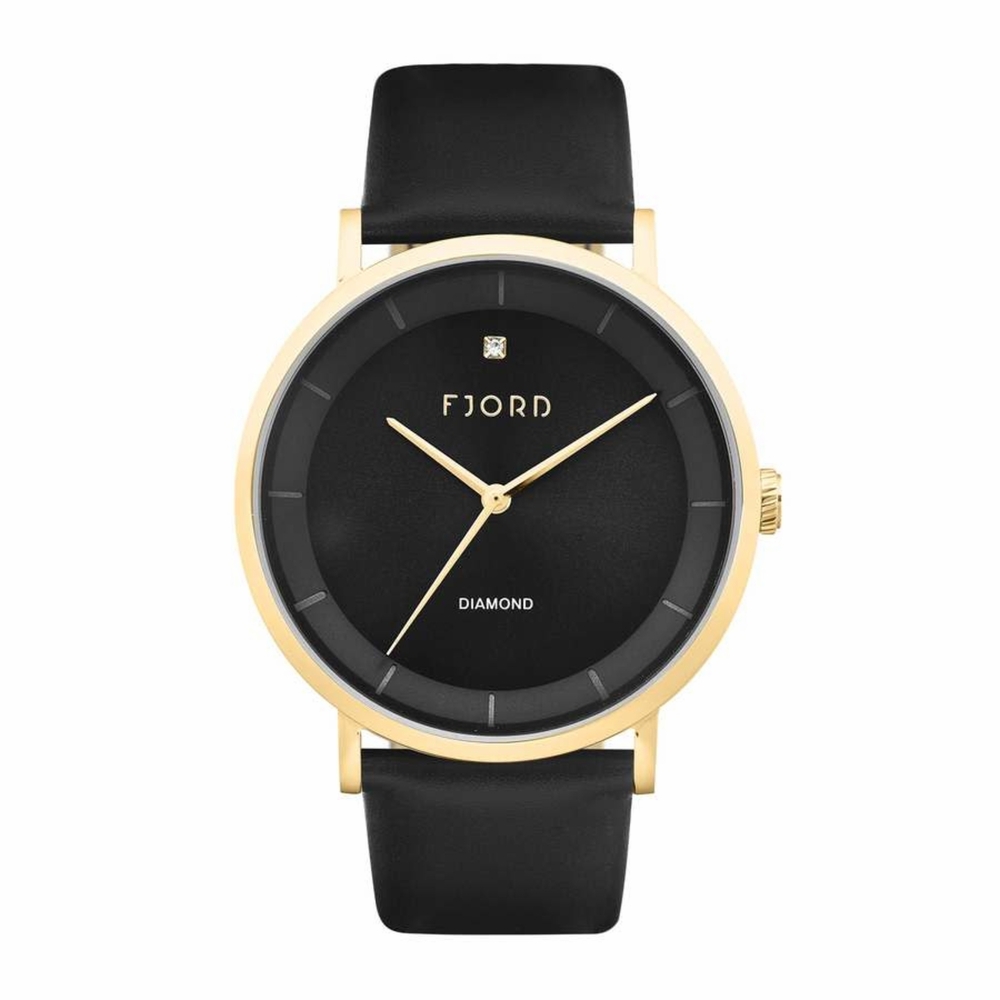 Yellow gold-tone stainless steel case with a black leather strap. Fixed yellow gold-tone stainless steel bezel. Black dial with yellow gold-tone hands and index hour markers. Dial Type: Analog. Quartz movement. Round case shape, case size: 42 mm. Functions: hour, minute, second. Jensen Series. Dress watch style. Fjord Jensen Black Dial Mens Watch FJ-3045-04.