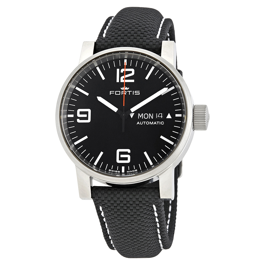 Silver-tone stainless steel case with a black leather strap. Fixed silver-tone stainless steel bezel. Black dial with luminous silver-tone hands and index hour markers. Arabic numerals mark the 6, 9 and 12 o'clock positions. minute markers around the outer rim. Dial Type: Analog. Luminescent hands and markers. Day of the week and date display at the 3 o'clock position. ETA Caliber 2836-2 automatic movement with a 40-hour power reserve. Scratch resistant sapphire crystal. Solid case back. Round case shape, case size: 40 mm, case thickness: 11.8 mm. Band width: 20 mm. Tang clasp. Water resistant at 100 meters / 330 feet. Functions: date, day, hour, minute, second. Additional Info: bilingual english & german. Casual watch style. Watch label: Swiss Made. Fortis Spacematic Automatic Black Dial Mens Watch 623.10.18LP.01.