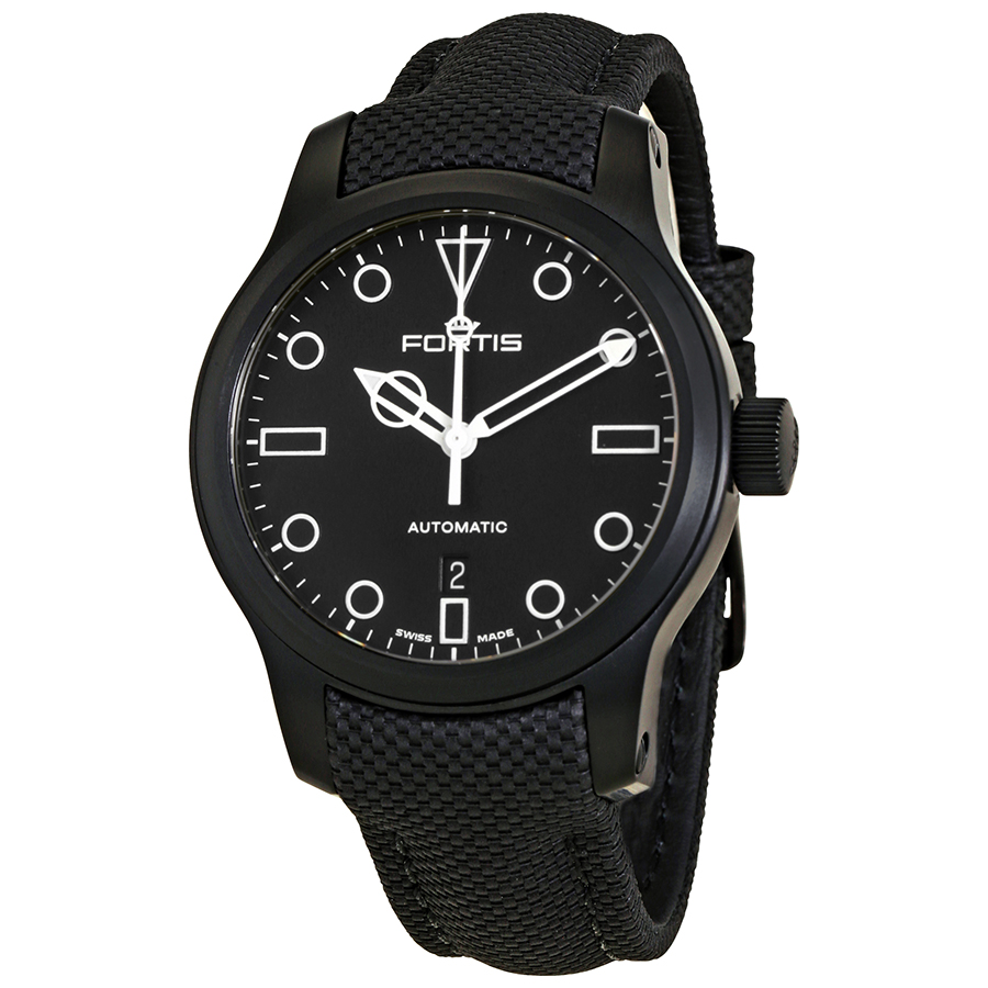 Black PVD stainless steel case with a black performance leather strap. Fixed black PVD bezel. Black dial with white skeleton hands and dot hour markers. Minute markers around the outer rim. Dial Type: Analog. Date display at the 6 o'clock position. ETA 2836-2N automatic movement with a 38-hour power reserve. Scratch resistant sapphire crystal. Screw down crown. Transparent case back. Case size: 42 mm. Case thickness: 12 mm. Round case shape. Band width: 20 mm. Tang clasp. Water resistant at 200 meters / 660 feet. Functions: date, hour, minute, second. Casual watch style. Watch label: Swiss Made. Fortis Shoreliner Vik Beach A.M. Automatic Mens Watch 655.18.31LP.10.