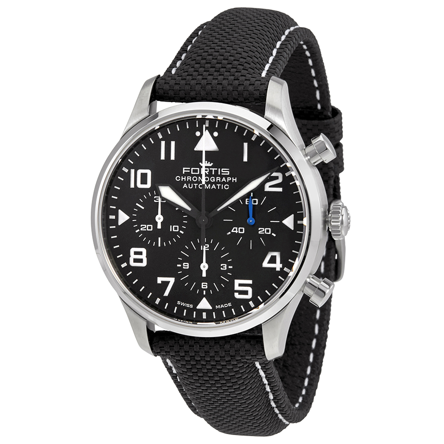 Stainless steel case with a black leather strap. Fixed stainless steel bezel. Black dial with luminous black hands and Arabic numeral hour markers. Minute markers around the outer rim. Dial Type: Analog. Luminescent hands and markers. Chronograph - three sub-dials displaying: 60 second, 30 minute and 12 hour. Automatic movement. Scratch resistant sapphire crystal. Screw down crown. Transparent case back. Case size: 41 mm. Case thickness: 12 mm. Round case shape. Band width: 20 mm. Tang clasp. Water resistant at 50 meters / 165 feet. Functions: chronograph, hour, minute, second. Casual watch style. Watch label: Swiss Made. Fortis Aviatis Pilot Classic Chronograph Mens Watch 904.21.41 LP.01.