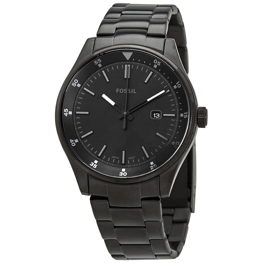 Black stainless steel case with a black stainless steel bracelet. Fixed black stainless steel bezel. Black dial with black hands and index hour markers. Minute markers around the outer rim. Dial Type: Analog. Luminescent hands. Date display at the 3 o'clock position. Quartz movement. Scratch resistant mineral crystal. Pull / push crown. Solid case back. Round case shape, case size: 44 mm, case thickness: 11 mm. Band width: 22 mm. Fold over with safety release clasp. Water resistant at 50 meters / 165 feet. Functions: date, hour, minute, second. Casual watch style. Watch label: Japan Movt. Fossil Belmar Quartz Black Dial Mens Watch FS5531.