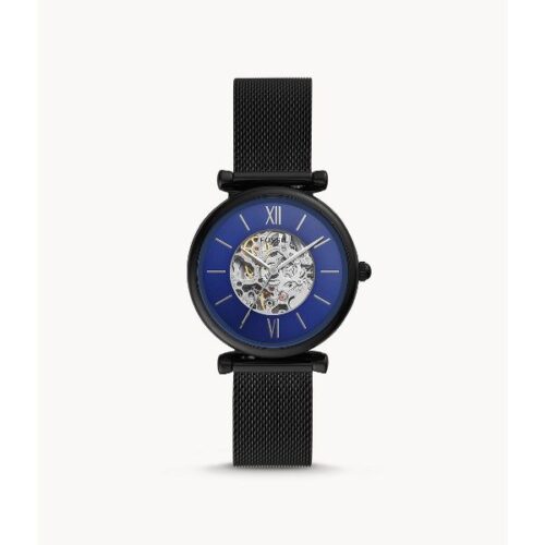 Black-plated stainless steel case with a black-plated stainless steel mesh bracelet. Fixed black-plated bezel. Blue (skeleton cener) dial with silver-tone hands and index hour markers. Roman numerals appear at the 6 and 12 o'clock positions. Dial Type: Analog. Automatic movement. Scratch resistant mineral crystal. Pull / push crown. Transparent case back. Round case shape. Case size: 35 mm. Case thickness: 9 mm. Band width: 16 mm. Fold over slip through clasp. Water resistant at 50 meters / 165 feet. Functions: hour, minute, second. Carlie Series. Casual watch style. Fossil Carlie Automatic Blue Dial Ladies Watch ME3177.