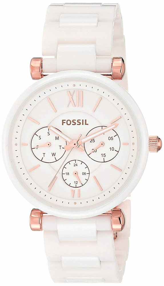White ceramic case with a white ceramic bracelet. Fixed white ceramic bezel. White dial with luminous rose gold-tone hands and index hour markers. Roman numerals appear at the 6 and 12 o'clock positions. Dial Type: Analog. Luminescent hands. Three multi-function sub-dials displaying: 24 hours, date and days of the week. Quartz movement. Scratch resistant mineral crystal. Pull / push crown. Solid case back. Round case shape. Case size: 38 mm. Case thickness: 9 mm. Band width: 18 mm. Fold over clasp with a push button release. Water resistant at 30 meters / 100 feet. Functions: chronograph, hour, minute, second. Carlie Series. Casual watch style. Fossil Carlie Chronograph Quartz White Dial Ladies Watch CE1093.