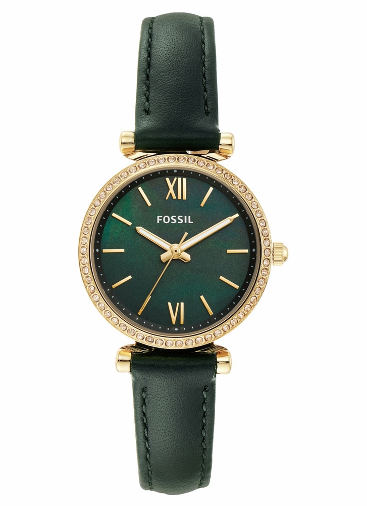 Yellow gold-tone stainless steel case with a green leather strap. Fixed yellow gold-tone bezel set with crystals. Green dial with luminous yellow gold-tone hands and index hour markers. Roman numerals appear at the 6 and 12 o'clock positions. Dial Type: Analog. Luminescent hands. Quartz movement. Scratch resistant mineral crystal. Pull / push crown. Solid case back. Round case shape. Case size: 28 mm. Case thickness: 7 mm. Band width: 12 mm. Tang clasp. Water resistant at 30 meters / 100 feet. Functions: hour, minute, second. Carlie Mini Series. Dress watch style. Fossil Carlie Mini Quartz Crystal Green Dial Ladies Watch ES4651.