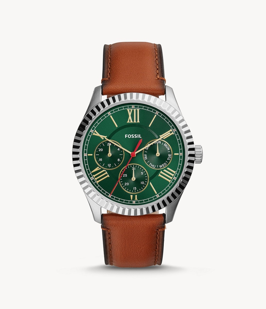 Stainless steel case with a brown leather strap. Fixed fluted stainless steel bezel. Green dial with yellow gold-tone hands and alternating Roman numeral and index hour markers. Minute markers around the outer rim. Dial Type: Analog. Three multi-function sub-dials displaying: 24 hours, date and day of the week. Quartz movement. Scratch resistant mineral crystal. Solid case back. Round case shape. Case size: 44 mm. Case thickness: 12 mm. Band width: 22 mm. Tang clasp. Water resistant at 50 meters / 165 feet. Functions: date, day, hour, minute, second, 24 hour. Chapman Series. Casual watch style. Fossil Chapman Quartz Green Dial Mens Watch FS5736.