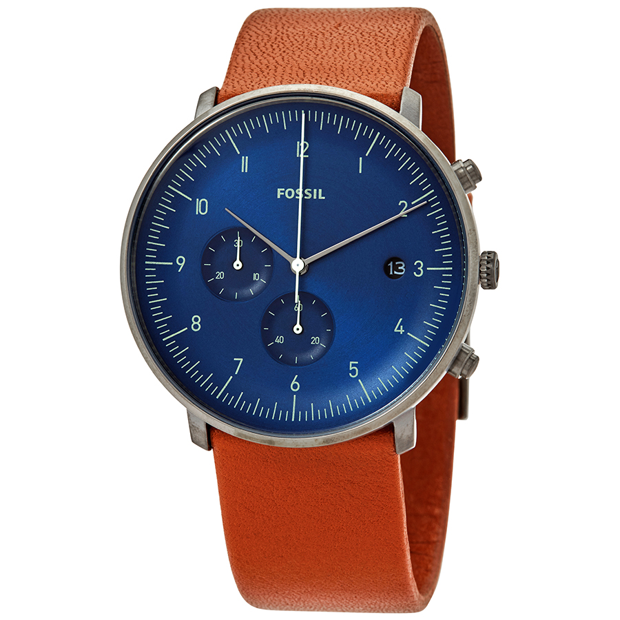 Stainless steel case with a light brown luggage leather strap. Fixed stainless steel bezel. Blue dial with silver-tone hands and Arabic numeral hour markers. Minute markers around the outer rim. Dial Type: Analog. Date display at the 3 o'clock position. Chronograph - two sub-dials displaying: 60 second and 30 minute. Quartz movement. Scratch resistant mineral crystal. Pull / push crown. Solid case back. Round case shape. Case size: 42 mm. Case thickness: 10 mm. Band width: 22 mm. Tang clasp. Water resistant at 30 meters / 100 feet. Functions: chronograph, date, hour, minute, second. Casual watch style. Fossil Chase Timer Chronograph Quartz Blue Dial Mens Watch FS5486.