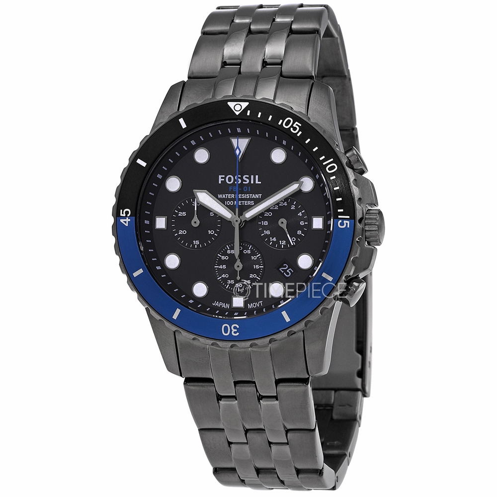 Smoke-plated stainless steel case and bracelet. Fixed smoke-plated bezel with an inlaid blue and black ring. Black dial with luminous grey hands and dot hour markers. Minute markers around the outer rim. Dial Type: Analog. Luminescent hands and markers. Date display between the 4 and 5 o'clock positions. Chronograph - three sub-dials displaying: 60 second, 60 minute and 12-24 hour. Quartz movement. Scratch resistant mineral crystal. Pull / push crown. Solid case back. Round case shape. Case size: 42 mm. Case thickness: 12 mm. Band width: 22 mm. Fold over clasp with a safety release. Water resistant at 100 meters / 330 feet. Functions: chronograph, date, hour, minute, second. Fb-01 Series. Dress watch style. Watch label: Japan Movt. Fossil FB-01 Chronograph Quartz Black Dial Mens Watch FS5835.