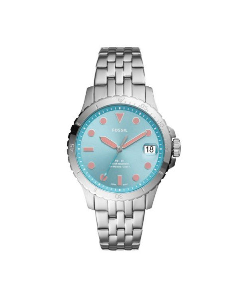 Stainless steel case with a stainless steel bracelet. Fixed stainless steel bezel. Blue dial with luminous silver-tone hands and dot hour markers. Minute markers around the outer rim. Dial Type: Analog. Luminescent hands and markers. Date display at the 3 o'clock position. Quartz movement. Scratch resistant mineral crystal. Solid case back. Round case shape. Case size: 36 mm. Case thickness: 10 mm. Band width: 18 mm. Fold over clasp with a push button release. Water resistant at 100 meters / 330 feet. Functions: date, hour, minute, second. Fb-01 Series. Casual watch style. Watch label: Japan Movt. Fossil FB-01 Quartz Blue Dial Ladies Watch ES4742.