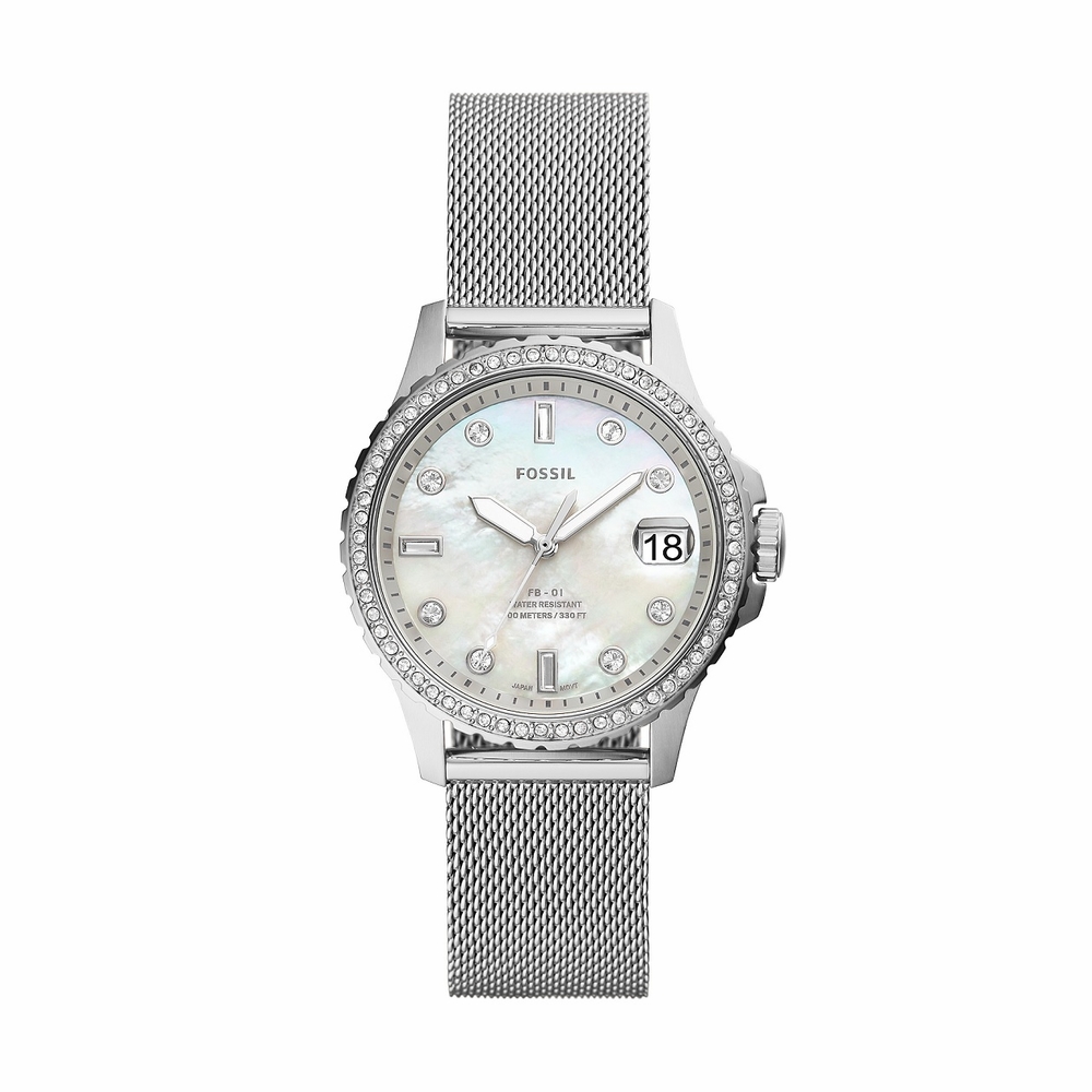 Stainless steel case with a stainless steel mesh bracelet. Fixed stainless steel bezel set with crystals. Mother of pearl dial with luminous silver-tone hands and index hour markers. Minute markers around the outer rim. Dial Type: Analog. Luminescent hands. Date display at the 3 o'clock position. Quartz movement. Scratch resistant mineral crystal. Pull / push crown. Solid case back. Round case shape. Case size: 36 mm. Case thickness: 10 mm. Band width: 18 mm. Fold over slip through clasp. Water resistant at 100 meters / 330 feet. Functions: date, hour, minute, second. Fb-01 Series. Dress watch style. Watch label: Japan Movt. Fossil FB-01 Quartz Crystal Mother of Pearl Dial Ladies Watch ES4998.