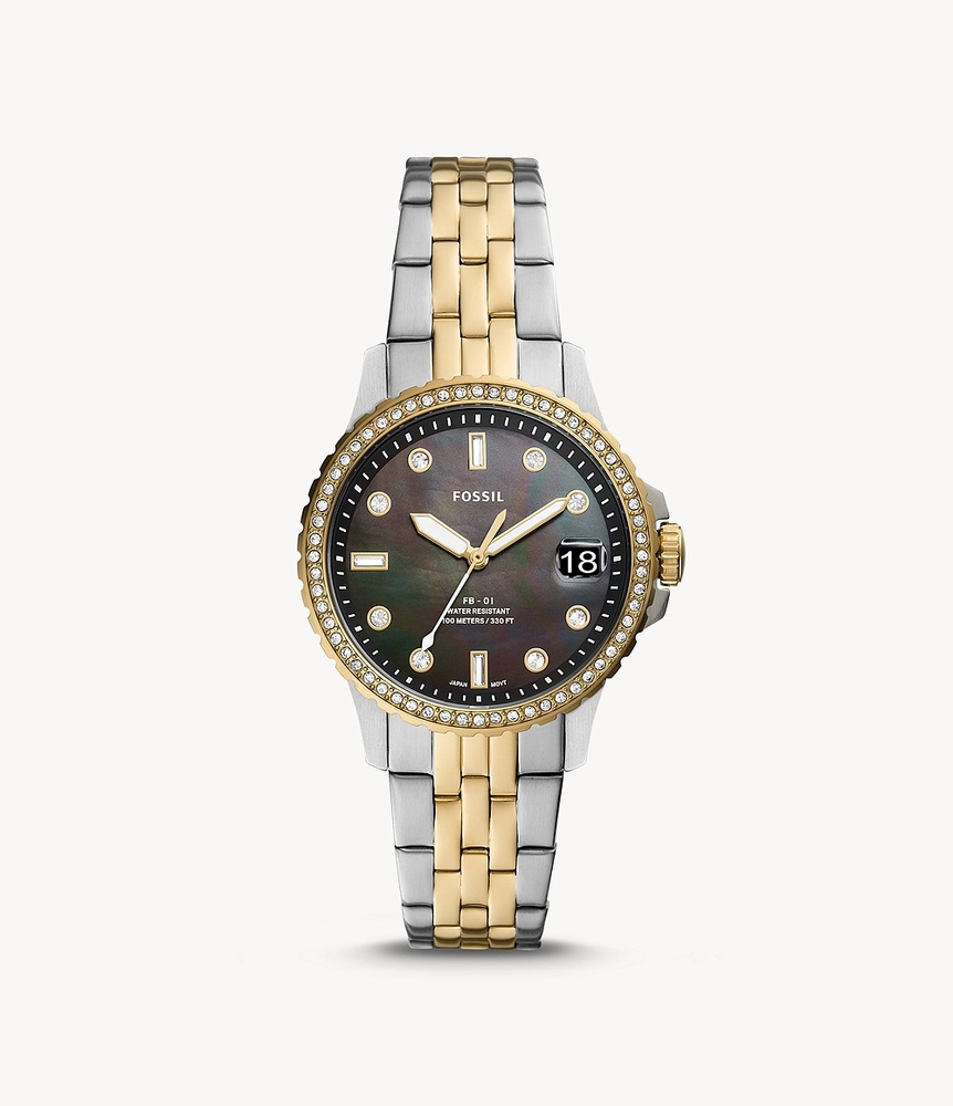 Stainless steel case with a two-tone (silver-tone and gold-tone) stainless steel bracelet. Fixed gold-tone bezel set with crystals. Black mother of pearl dial with gold-tone hands and crystal hour markers. Minute markers around the outer rim. Dial Type: Analog. Luminescent hands. Date display at the 3 o'clock position. Quartz movement. Scratch resistant mineral crystal. Pull / push crown. Solid case back. Round case shape. Case size: 36 mm. Case thickness: 10 mm. Band width: 18 mm. Fold over clasp. Water resistant at 100 meters / 330 feet. Functions: date, hour, minute, second. Fb-01 Series. Dress watch style. Watch label: Japan Movt. Fossil FB-01 Quartz Crystal Black Mother of Pearl Dial Ladies Watch ES4997.
