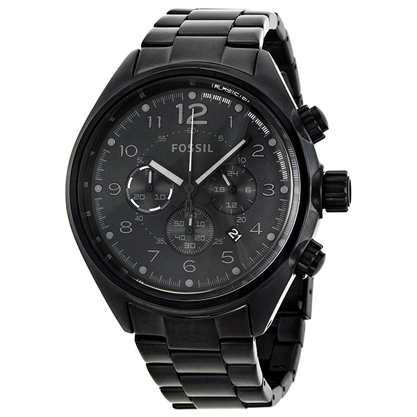 Black ion-plated stainless steel case and bracelet. Fixed black ion-plated bezel. Black dial with grey hands and Arabic numeral hour markers. Minute markers. Tachymeter around the outer rim. Dial Type: Analog. Luminescent hands and markers. Date display between 4 and 5 o'clock positions. Chronograph - three sub-dials displaying: 60 second, 30 minute and 24 hour. Quartz movement. Scratch resistant mineral crystal. Pull / push crown. Solid case back. Case diameter: 46 mm. Case thickness: 15 mm. Round case shape. Band width: 22 mm. Fold over clasp with safety release. Water resistant at 50 meters / 165 feet. Functions: chronograph, date, hour, minute, second. Casual watch style. Fossil Flight Chronograph Black Ion-plated Mens Watch CH2803.