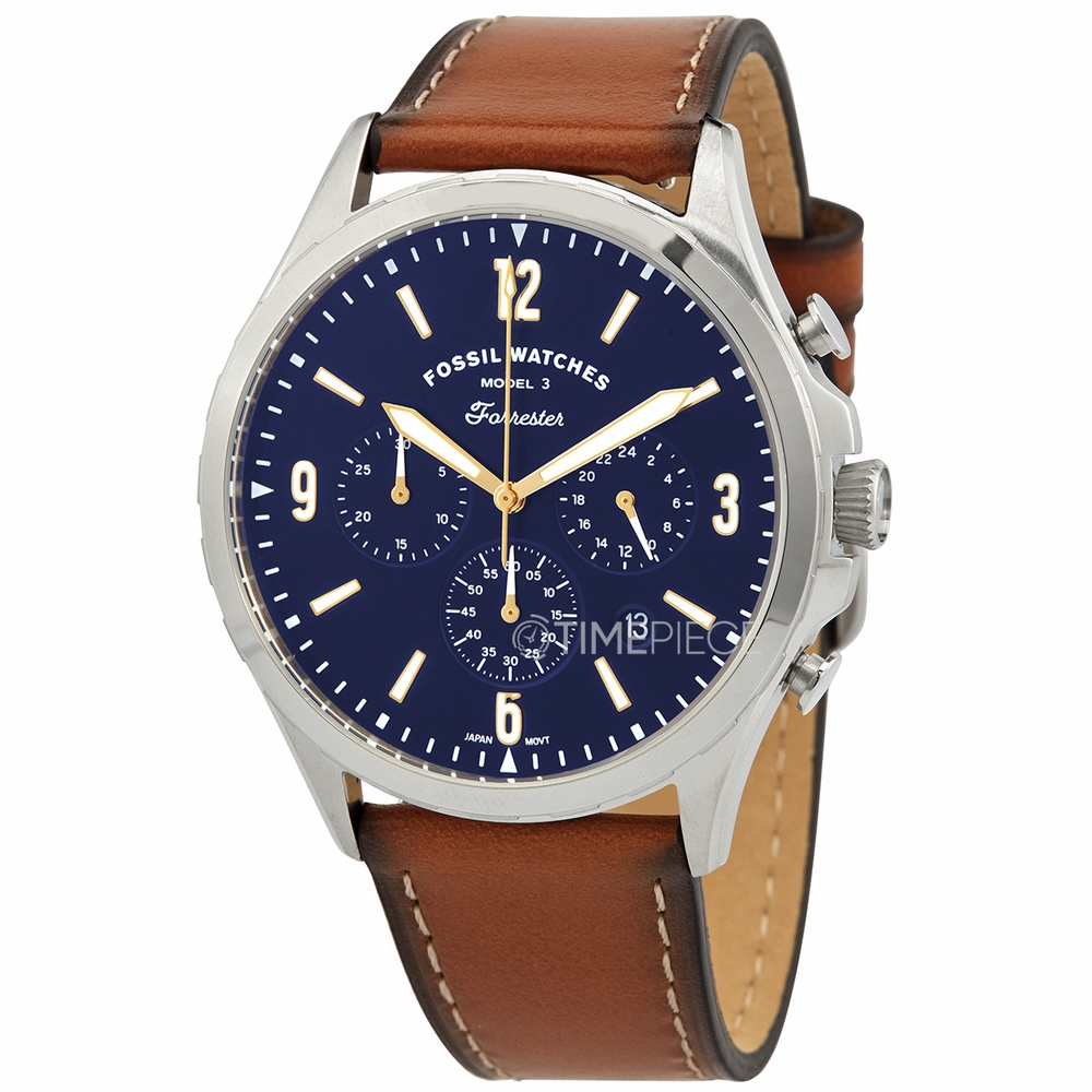Stainless steel case with a brown leather strap. Fixed stainless steel bezel. Blue dial with luminous gold-tone hands and index hour markers. Arabic numerals appear at the 3, 6, 9 and 12 o'clock positions. Minute markers around the outer rim. Dial Type: Analog. Luminescent hands. Date display between the 4 and 5 o'clock positions. Chronograph - three sub-dials displaying: 60 second, 30 minute and 24 hours. Quartz movement. Scratch resistant mineral crystal. Pull / push crown. Solid case back. Round case shape. Case size: 46 mm. Case thickness: 11 mm. Band width: 24 mm. Tang clasp. Water resistant at 50 meters / 165 feet. Functions: chronograph, date, hour, minute, second. Forrester Series. Dress watch style. Watch label: Japan Movt. Fossil Forrester Chronograph Quartz Blue Dial Mens Watch FS5607.