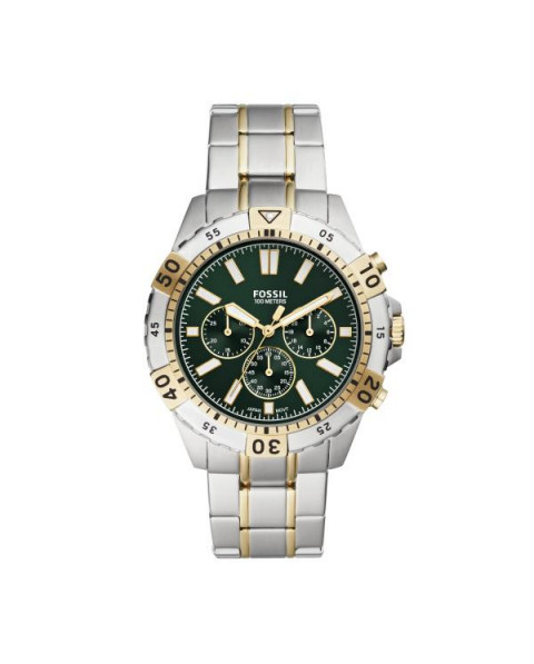 Stainless steel case with a two-tone (silver-tone and yellow gold-tone) stainless steel bracelet. Uni-directional rotating two-tone (silver-tone and yellow gold-tone) bezel. Green dial with luminous yellow gold-tone hands and index hour markers. Minute markers around the outer rim. Dial Type: Analog. Luminescent hands. Chronograph - three sub-dials displaying: 60 second, 30 minute and 24 hour. Quartz movement. Scratch resistant mineral crystal. Integrated crown. Solid case back. Round case shape. Case size: 44 mm. Case thickness: 12 mm. Band width: 22 mm. Fold over clasp with a push button release. Water resistant at 100 meters / 330 feet. Functions: chronograph, hour, minute, second. Garrett Series. Casual watch style. Watch label: Japan Movt. Fossil Garrett Chronograph Quartz Green Dial Mens Watch FS5622.