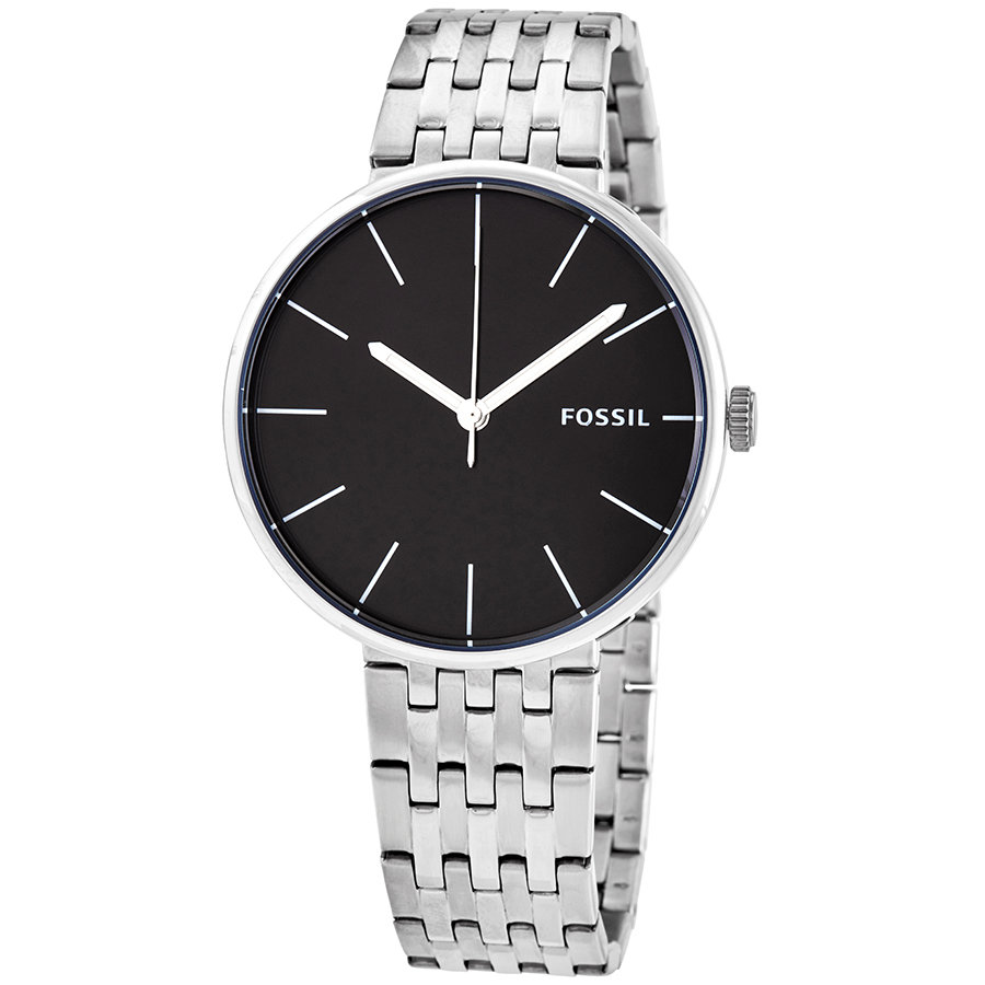 Silver-tone stainless steel case with a silver-tone stainless steel bracelet. Fixed silver-tone stainless steel bezel. Black dial with silver-tone hands and index hour markers. Dial Type: Analog. Luminescent hands. Quartz movement. Scratch resistant mineral crystal. Pull / push crown. Solid case back. Round case shape, case size: 42 mm, case thickness: 8 mm. Band width: 20. Fold over with safety release clasp. Water resistant at 50 meters / 165 feet. Functions: hour, minute, second. Casual watch style. Watch label: Japan Movt. Fossil Hutton Quartz Black Dial Mens Watch BQ2439.