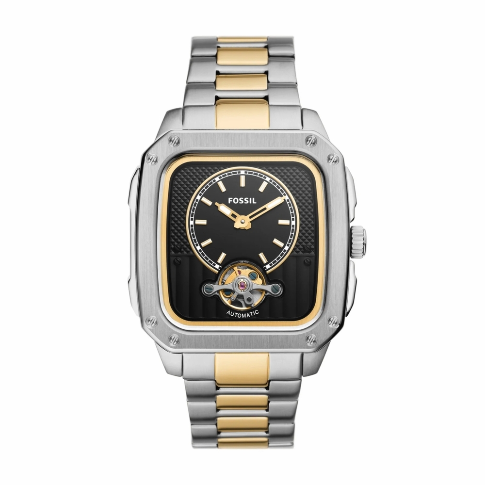 Silver-tone stainless steel case with a two-tone (silver-tone and gold-tone) stainless steel bracelet. Fixed silver-tone stainless steel bezel. Black dial with gold-tone hands and index hour markers. Minute markers around the outer rim. Dial Type: Analog. Luminescent hands. Automatic movement. Scratch resistant mineral crystal. Pull / push crown. Transparent see through case back. Square case shape, case size: 42 mm, case thickness: 12 mm. Band width: 22 mm. Fold over clasp. Water resistant at 50 meters / 165 feet. Functions: hour, minute. Inscription Series. Dress watch style. Fossil Inscription Automatic Black Dial Mens Watch ME3237.