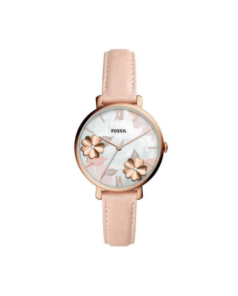 Rose gold-tone stainless steel case with a blush leather strap. Fixed rose gold-tone bezel. White (floral motif) dial with rose gold-tone hands and index hour markers. Roman numerals mark the 6 and 12 o'clock positions. Dial Type: Analog. Quartz movement. Scratch resistant mineral crystal. Pull / push crown. Solid case back. Round case shape. Case size: 36 mm. Case thickness: 8 mm. Band width: 14 mm. Tang clasp. Water resistant at 30 meters / 100 feet. Functions: hour, minute, second. Jacqueline Series. Casual watch style. Fossil Jacqueline Quartz White Dial Ladies Watch ES4671.