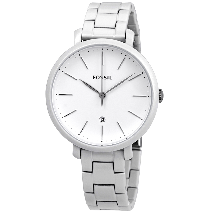 Stainless steel case with a stainless steel bracelet. Fixed stainless steel bezel. Pearl white dial with silver-tone hands and index hour markers. Minute markers around the outer rim. Dial Type: Analog. Date display above the 6 o'clock position. Quartz movement. Scratch resistant mineral crystal. Pull / push crown. Solid case back. Round case shape. Case size: 36 mm. Case thickness: 7 mm. Band width: 14 mm. Fold over clasp with a push button release. Water resistant at 30 meters / 100 feet. Functions: date, hour, minute, second. Casual watch style. Fossil Jacqueline Satin Dial Ladies Watch ES4397.