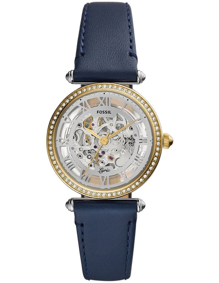 Stainless steel case with a navy leather strap. Fixed gold-tone stainless steel set with crystals bezel. Silver (skeleton center) dial with gold-tone hands and dots hour markers. Minute markers around the outer rim. Dial Type: Analog. Automatic movement. Scratch resistant mineral crystal. Pull / push crown. Transparent case back. Round case shape. Case size: 33 mm. Case thickness: 8.5 mm. Band width: 18 mm. Tang clasp. Water resistant at 50 meters / 165 feet. Functions: hour, minute, second. Lyric Series. Casual watch style. Fossil Lyric Automatic Crystal Silver Skeleton Dial Ladies Watch ME3199.