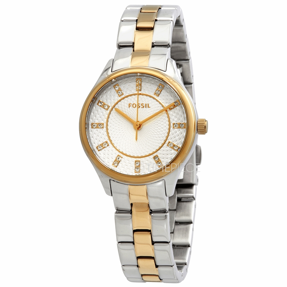 Stainless steel case with a two-tone (silver-tone and yellow gold-tone) stainless steel bracelet. Fixed yellow gold-tone bezel. Silver dial with gold-tone hands and crystal idex hour markers. Dial Type: Analog. Quartz movement. Scratch resistant mineral crystal. Pull / push crown. Solid case back. Round case shape. Case size: 30 mm. Case thickness: 10 mm. Band width: 14 mm. Fold over clasp. Water resistant at 50 meters / 165 feet. Functions: hour, minute, second. Modern Sophisticate Series. Casual watch style. Fossil Modern Sophisticate Quartz Crystal Silver Dial Ladies Watch BQ1574.