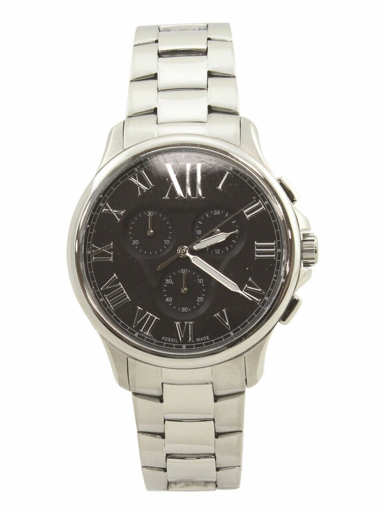 Stainless steel case with a stainless steel bracelet. Fixed stainless steel bezel. Black dial with luminous silver-tone hands and Roman numeral hour markers. Minute markers around the outer rim. Dial Type: Analog. Luminescent hands. Chronograph - three sub-dials displaying: 60 second, 30 minute and 24 hour. Quartz movement. Scratch resistant mineral crystal. Pull / push crown. Solid case back. Round case shape. Case size: 44 mm. Case thickness: 11 mm. Band width: 22 mm. Fold over clasp with a push button release. Water resistant at 50 meters / 165 feet. Monty Series. Casual watch style. Fossil Monty Quartz Black Dial Stainless Steel Mens Watch FS5637.