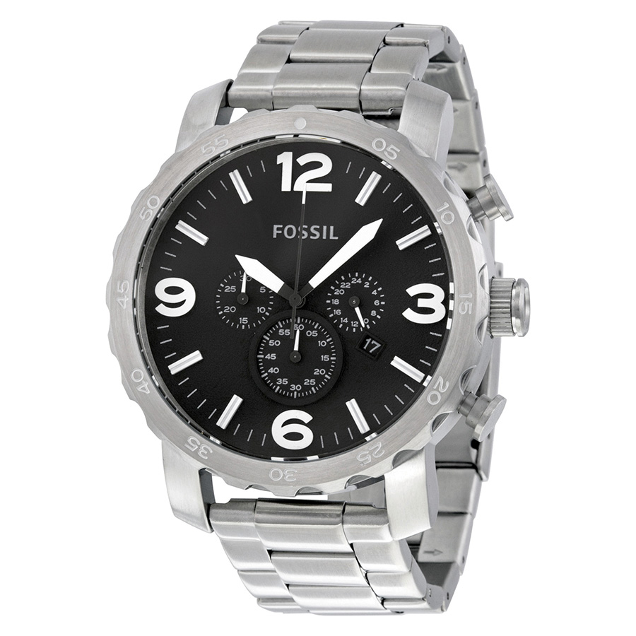 Stainless steel case and bracelet. Fixed stainless steel bezel. Black dial with luminous silver-tone hands and index hour markers. Arabic numerals mark the 3, 6, 9 and 12 o'clock positions. Minute markers around the outer rim. Dial Type: Analog. Luminescent hands and markers. Date display at the 4 o'clock position. Chronograph - three sub-dials displaying: 60 second, 30 minute and 24 hour. Quartz movement. Scratch resistant sapphire crystal. Pull / push crown. Solid case back. Case diameter: 50 mm. Case thickness: 13 mm. Round case shape. Band width: 24 mm. Band length: 7.75 inches. Fold over clasp with a safety release. Water resistant at 50 meters / 165 feet. Functions: chronograph, date, hour, minute, second. Casual watch style. Fossil Nate Chronograph Black Dial Mens Watch JR1353