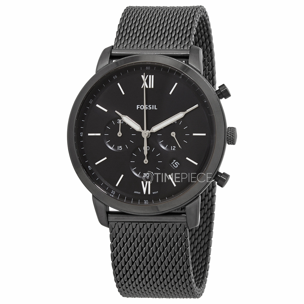 Black-plated stainless steel case with a black-plated stainless steel mesh bracelet. Fixed black-plated bezel. Black dial with luminous silver-tone hands and index hour markers. Roman numerals appear at the 6 and 12 o'clock positions. Minute markers around the outer rim. Dial Type: Analog. Luminescent hands and markers. Date display between the4 and 5 o'clock positions. Chronograph - three sub-dials displaying: 60 second, 30 minute and 24 jours. Quartz movement. Scratch resistant mineral crystal. Pull / push crown. Solid case back. Round case shape. Case size: 44 mm. Case thickness: 12 mm. Band width: 22 mm. Fold over slip throgh clasp. Water resistant at 50 meters / 165 feet. Functions: chronograph, date, hour, minute, second. Neutra Series. Dress watch style. Fossil Neutra Chronograph Quartz Black Dial Mens Watch FS5699.