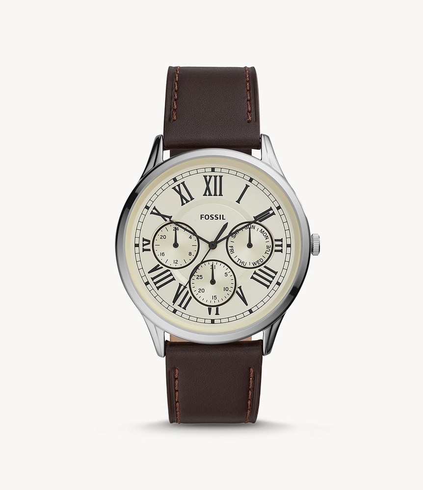 Stainless steel case with a brown leather strap. Fixed stainless steel bezel. Cream dial with black hands and Roman numeral hour markers. Minute markers around the outer rim. Three multi-function sub-dials displaying: 24 hours, date and day of the week. Quartz movement. Scratch resistant mineral crystal. Pull / push crown. Solid case back. Round case shape. Case size: 44 mm. Case thickness: 11 mm. Band width: 22 mm. Tang clasp. Water resistant at 50 meters / 165 feet. Functions: date, day, hour, minute, second, 24 hour. Pierce Series. Casual watch style. Fossil Pierce Quartz Cream Dial Brown Leather Mens Watch FS5680.