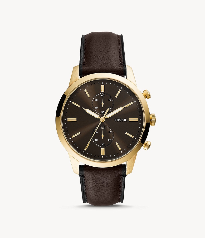Gold-tone stainless steel case with a brown leather strap. Fixed gold-tone bezel. Black dial with luminous gold-tone hands and index hour markers. Minute markers around the outer rim. Dial Type: Analog. Luminescent hands and markers. Chronograph - two sub-dials displaying: 60 minutes, 60 seconds. Quartz movement. Scratch resistant mineral crystal. Pull / push crown. Solid case back. Round case shape. Case size: 44 mm. Case thickness: 12 mm. Band width: 22 mm. Tang clasp. Water resistant at 50 meters / 165 feet. Functions: chronograph, hour, minute, second. Townsman Series. Casual watch style. Fossil Townsman Chronograph Quartz Black Dial Mens Watch FS5774.