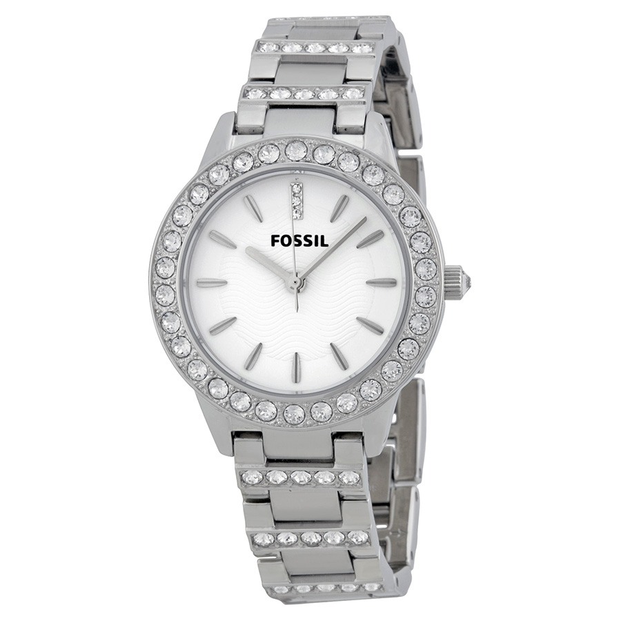 Stainless steel case with a stainless steel bracelet set with crystals. Fixed silver-tone bezel set with crystals. White dial with luminous hands and index hour markers. Crystal-set stick marks the 12 o'clock position. Dial Type: Analog. Quartz movement. Scratch resistant mineral crystal. Solid case back. Case diameter: 34 mm. Case thickness: 8 mm. Round case shape. Band width: 15 mm. Jewelry clasp. Water resistant at 50 meters / 165 feet. Functions: hours, minutes, seconds. Dress watch style. Fossil Glitz White Dial Stainless Steel Ladies Watch ES2362.