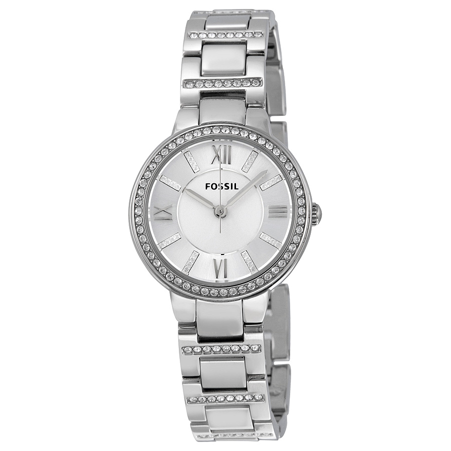 Stainless steel case with a stainless steel bracelet with crystal-set bars. Fixed silver-tone bezel set with crystals. Silver dial with silver-toned hands and crystal-filled index hour markers. Roman numerals mark the 3, 6. 9 and 12 o'clock positions. Dial Type: Analog. Luminescent hands. Quartz movement. Scratch resistant mineral crystal. Pull / push crown. Solid case back. Case diameter: 30 mm. Case thickness: 9 mm. Round case shape. Band width: 14 mm. Jewelry clasp. Water resistant at 50 meters / 165 feet. Functions: hour, minute, second. Dress watch style. Fossil Virginia Silver Dial Stainless Steel Ladies Watch ES3282.