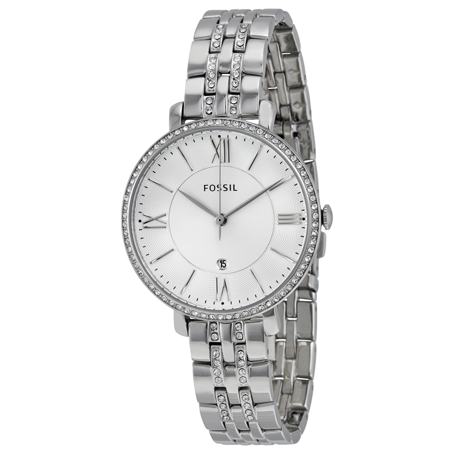 Stainless steel case with a stainless steel bracelet. Fixed stainless steel bezel set with crystals. Silver dial with silver-toned hands and index hour markers. Roman numerals mark the 3, 6, 9 and 12 o'clock positions. Minute markers around the outer rim. Dial Type: Analog. Date display at the 6 o'clock position. Quartz movement. Scratch resistant mineral crystal. Pull / push crown. Solid case back. Case diameter: 36 mm. Case thickness: 8 mm. Round case shape. Band width: 14 mm. Deployment clasp. Water resistant at 30 meters / 100 feet. Functions: date, hour, minute, second. Additional Info: 110 clear stones. Dress watch style. Fossil Jacqueline Silver Dial Stainless Steel Ladies Watch ES3545.