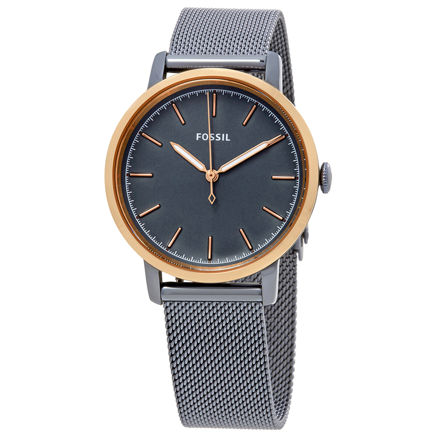 Blue ion-plated stainless steel case with a blue ion-plated stainless steel mesh bracelet. Fixed rose gold-tone bezel. Blue dial with luminous rose gold-tone hands and index hour markers. Minute markers around the outer rim. Dial Type: Analog. Luminescent hands and markers. Quartz movement. Scratch resistant mineral crystal. Pull / push crown. Solid case back. Round case shape, case size: 34 mm, case thickness: 9 mm. Band width: 16 mm. Fold over clasp with a safety release. Water resistant at 30 meters / 100 feet. Functions: hour, minute, second. Casual watch style. Fossil Neely Blue Dial Ladies Watch ES4312.