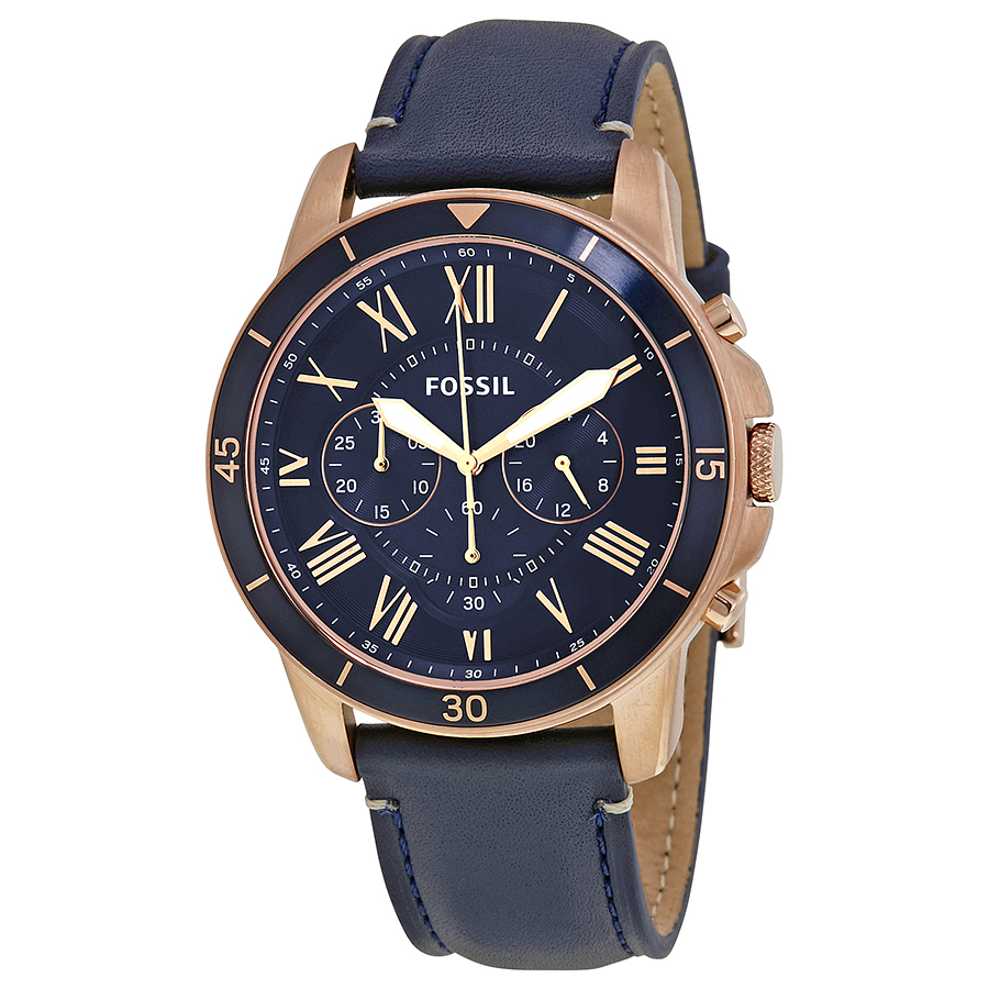 Rose gold-tone stainless steel case with a navy blue leather strap. Fixed rose gold-tone bezel with a blue top ring. Blue dial with luminous rose gold-tone hands and Roman numeral hour markers. Minute markers around the outer rim. Dial Type: Analog. Chronograph - three sub-dials displaying: 60 second, 30 minute and 24 hours. Quartz movement. Scratch resistant mineral crystal. Solid case back. Case size: 44 mm. Case thickness: 12 mm. Round case shape. Band width: 22 mm. Tang clasp. Water resistant at 50 meters / 165 feet. Functions: chronograph, hour, minute, second. Additional Info: in general, suitable for short periods of recreational swimming, but not diving or snorkeling. Sport watch style. Fossil Grant Sport Chronograph Blue Dial Mens Watch FS5237