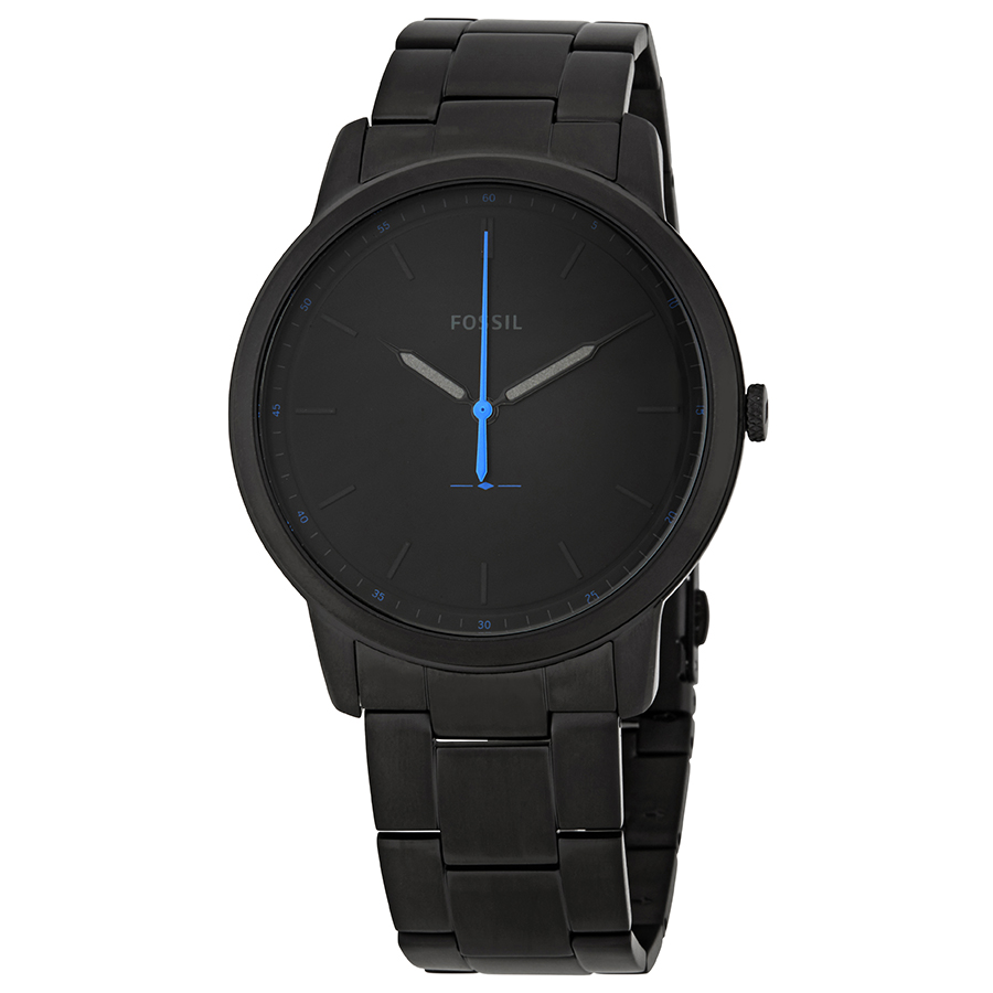 Black stainless steel case with a black stainless steel bracelet. Fixed black stainless steel bezel. Black satin dial with luminous black hands and index hour markers. Dial Type: Analog. Luminescent hands. Date display at the o'clock position. Quartz movement. Scratch resistant mineral crystal. Pull / push crown. Solid case back. Case size: 44 mm. Case thickness: 8 mm. Round case shape. Band width: 22 mm. Fold over clasp with a safety release. Water resistant at 50 meters / 165 feet. Functions: hour, minute, second. Casual watch style. Fossil The Minimalist Black Satin Dial Mens Watch FS5308.