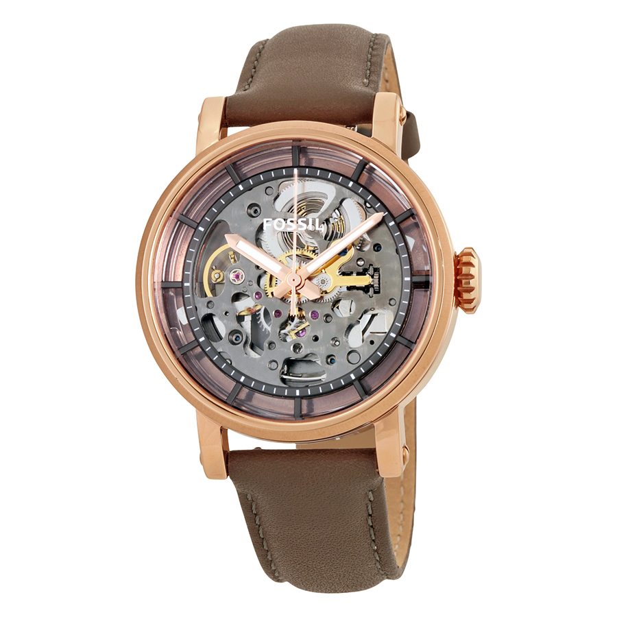 Rose gold-tone stainless steel case with a gray leather strap. Fixed rose gold-tone bezel. Skeleton dial with luminous rose gold-tone hands and index hour markers. Minute markers. Dial Type: Analog. Luminescent hands. Automatic movement. Scratch resistant mineral crystal. Pull / push crown. Transparent case back. Case size: 38 mm. Case thickness: 13 mm. Round case shape. Band width: 18 mm. Tang clasp. Water resistant at 50 meters / 165 feet. Functions: hour, minute, second. Casual watch style. Fossil Original Boyfriend Automatic Skeleton Dial Ladies Watch ME3089.